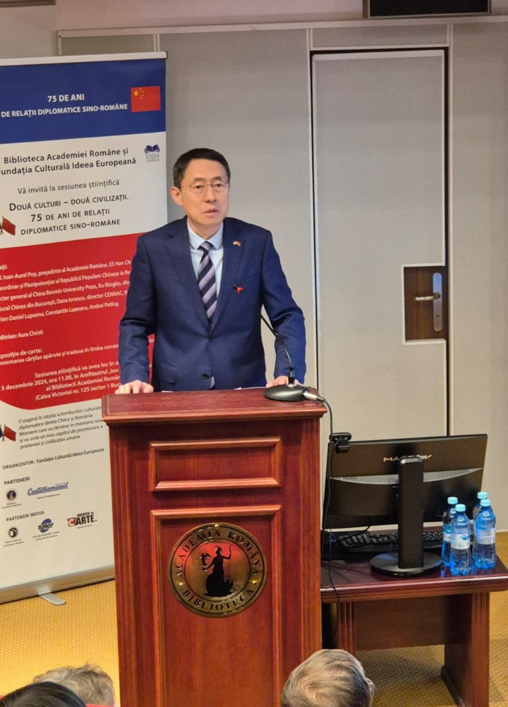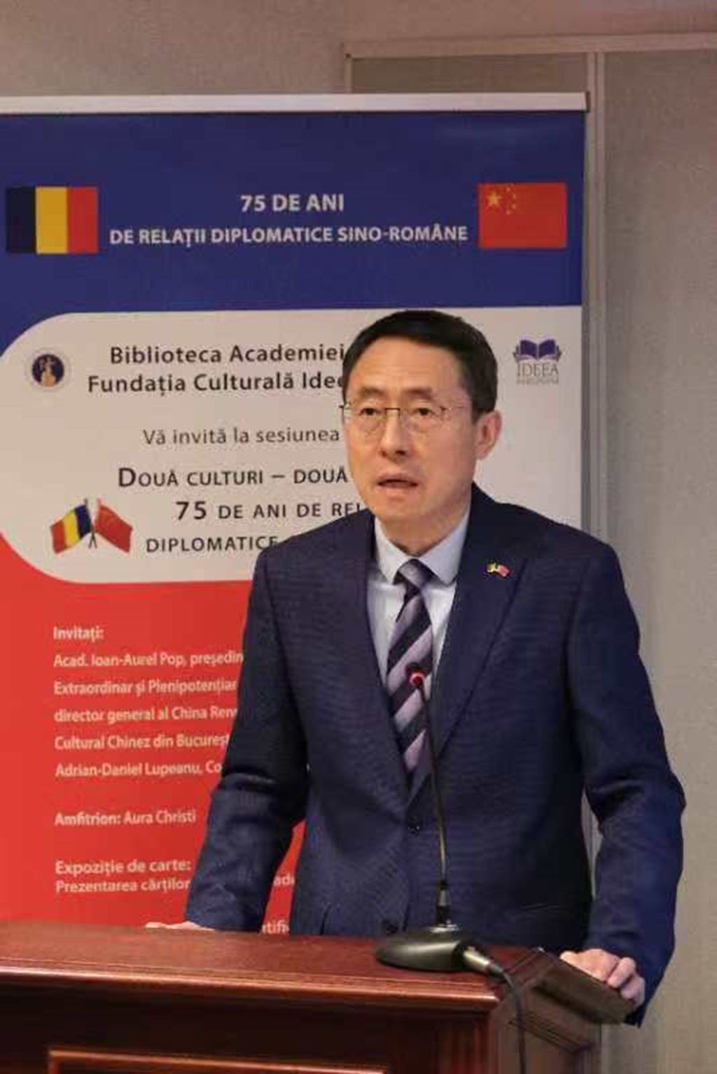 De asemenea, transmit mii de mulțumiri Academiei Române, Editurii Ideea Europeană și tuturor experților, academicienilor și prietenilor noștri care au contribuit activ la cooperarea și schimburile culturale dintre China și România. (…) Din 1949, când China și România au stabilit relații diplomatice, schimburile culturale dintre cele două civilizații și culturi au devenit din ce în ce mai strânse, jucând un rol important în promovarea înțelegerii și apropierii dintre popoare. De la plecarea în China a primului grup de studenți români în 1950 și până la inaugurarea celui de-al cincilea Institut Confucius la Iași, în 2024, de la semnarea acordului de cooperare culturală între cele două guverne în 1951 și până la activitățile culturale organizate împreună anul acesta pentru celebrarea a 75 de ani de relații sino-române, de la spectacolele oferite în China de un ansamblu artistic militar de 208 de persoane, venit din România, în 1952, și până la spectacolele de dans tradițional chinezesc organizate în România în 2024, de la ecranizarea primului film românesc în China, Viața învinge, în 1954, și până la organizarea Săptămânii Filmului Chinezesc anul acesta, de la expunea artefactelor chinezești în România în 1973 și până la continuarea cercetării arheologice realizate prin colaborare a vestigiilor culturii Cucuteni anul acesta, de la inaugurarea în 2015 a Institutului Cultural Român la Beijing și pâna la inaugrarea Centrului Cultural Chinez la București anul acesta, de la participarea Chinei ca invitat de onoare la Târgul Internațional de Carte Gaudeamus în 2016, la publicarea în acest an a traducerii în limba chineză a cărții De la romani la români a academicianului Ioan-Aurel Pop, schimburile culturale dintre cele două popoare s-au dovedit a fi nenumărate, acestea fiind manifestări vii ale dialogului și învățării reciproce dintre civilizația chineză și cea română și aducând o vitalitate durabilă prieteniei dintre cele două popoare.