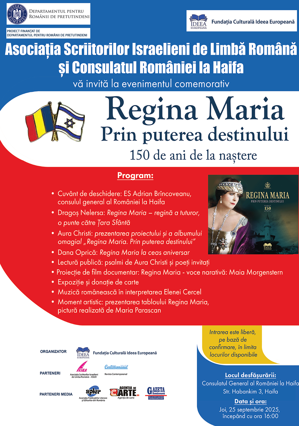 Fundația Culturală Ideea Europeană – în parteneriat cu Asociația Scriitorilor Israelieni de Limba Română (ASILR) și revista „Contemporanul”, aflată în preajma aniversării de 145 de ani de la înființare – a organizat în data de 25 septembrie 2025 o serie de evenimente la Consulatul General al României la Haifa, dedicate aniversării de 150 de ani de la nașterea reginei Maria.