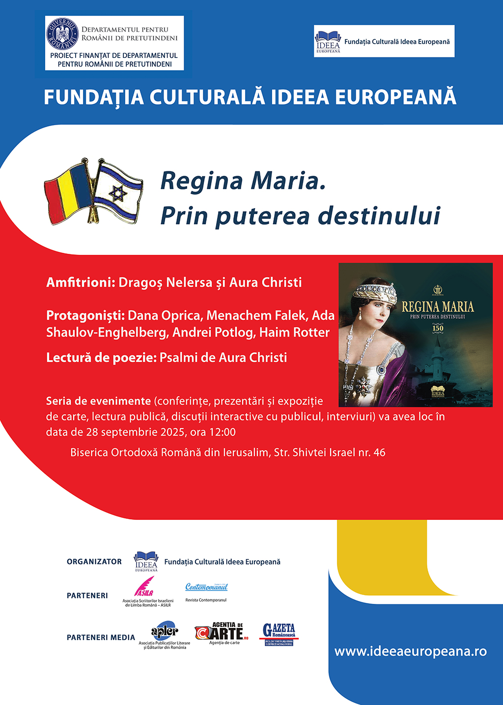 „Proiectul s‑a desfășurat în parteneriat cu insti­tuții de prestigiu, precum revista «Contemporanul», care apare sub egida Academiei Române, în colaborare cu instituții culturale româ­nești și israelite. Programul a cuprins conferințe și mese rotunde, spectacole și recitaluri, expoziții și lansări de carte, lecturi publice și sesiuni de auto­grafe, vizite oficiale la instituții culturale și civice. În centrul acestor manifestări s‑a aflat și se află – la ora la care văd lumina tiparului aceste rânduri continuă promovarea acestui valoros proiect inter­național – lansarea unui album aniversar dedicat Reginei Maria – «Regina Maria. Prin puterea destinu­lui» – realizat în condiții grafice de excepție, apărut la Editura Ideea Europeană în Colecția Academica – și ilustrat cu imagini rare din colecțiile Bibliotecii Academiei Române, ale Muzeului Național Peleș, Muzeului Național Cotroceni, Muzeului Național de Artă al României și altor colecții particulare. Albumul adună contribuțiile unor personalități de prim rang, între care acad. Ioan‑Aurel Pop, acad. Georgeta Filitti, Dumitru Preda, Liviu Țăranu, Răzvan Theodorescu, Ștefania Dinu, Narcis Dorin Ion și Aura Christi. Prin această inițiativă, Fundația Culturală Ideea Europeană aduce un omagiu Reginei Maria și întărește punțile de legătură dintre România și Israel, dintre țara de origine și diaspora românească, dintre memorie și actualitate, consolidând identitatea românească. Proiectul devine o celebrare a unei mari suverane și un act de continuitate culturală, spirituală și iden­titară, menit să reafirme rolul culturii românești ca punte de dialog și recunoaștere în spațiul universal.