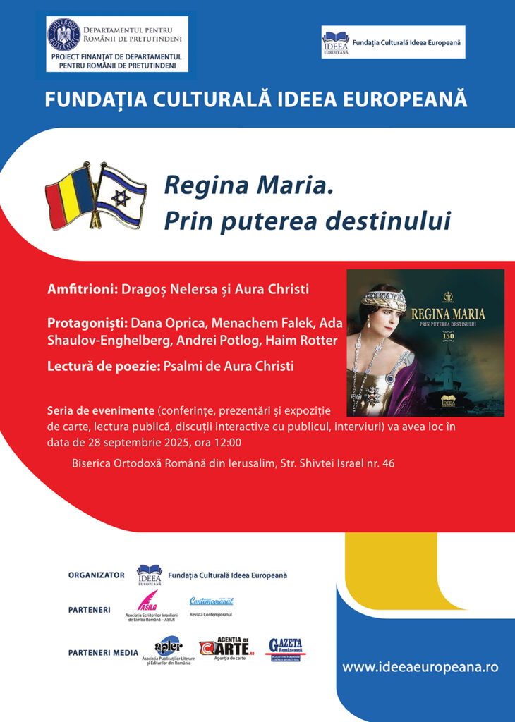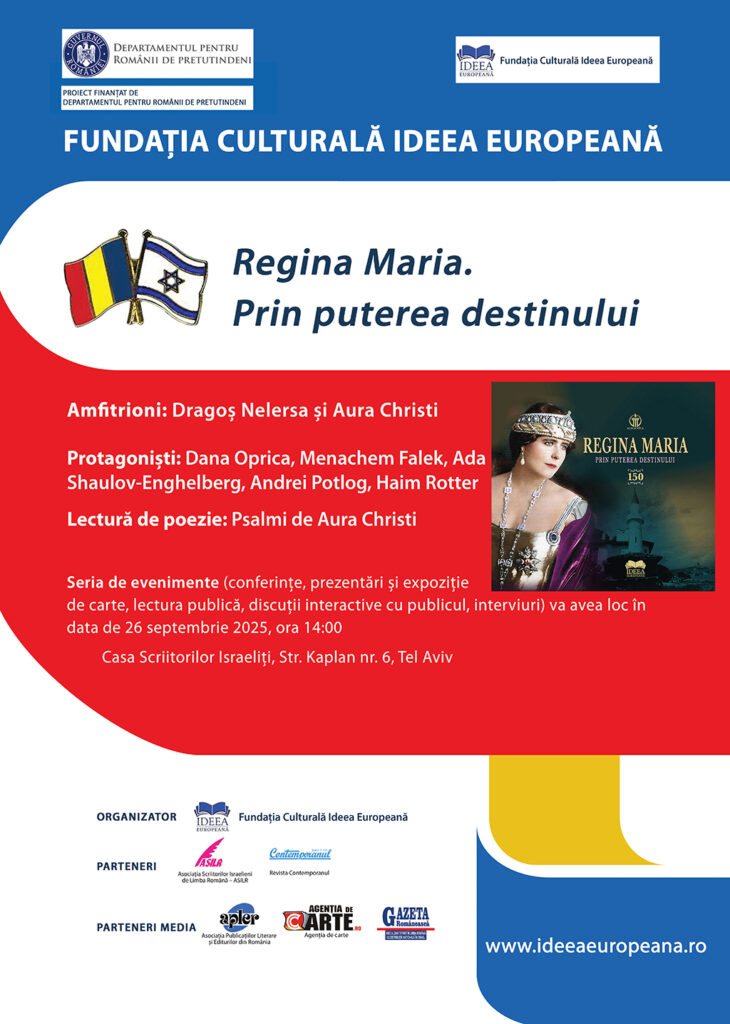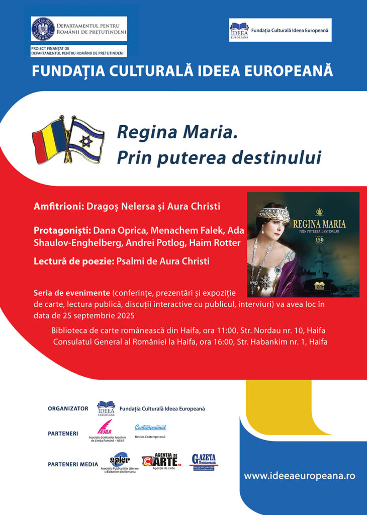 La Consulatul General al României la Haifa s-a desfășurat, cu succes, proiectul lansat la Biblioteca de carte românească din Haifa „Regina Maria. Prin puterea destinului”. În data de 25 septembrie 2025, ora 16.00, în prezența unei asistențe numeroase, într-o atmosferă luminoasă și deschisă, amfitrionii ES Adrian Brîncoveanu, Consulul General al României la Haifa, și Dragos Nelersa, președinte al Asociației Scriitorilor Israeliți de Limba Română – partener al proiectului organizat de Fundația Culturală Ideea Europeană – au inaugurat seria de evenimente organizate sub semnul regalității și al nevoii de a conserva, promova și fortifica identitatea națională, cu toate componentele acesteia (religioasă, etnică, lingvistică, culturală etc.). Cu sprijinul Departamentului pentru Românii de Pretutindeni, promovăm cultura și civilizația românească, și întărim legăturile dintre comunitatea românească israelită și România, abordând domeniul cultural și, respectiv, un model de vârf al culturii, civilizației și istoriei României: Regina Maria. E o necesitate stringentă în anul 2025, declarat „Anul Reginei Maria”, cu prilejul aniversării de 150 de ani de la naștere. Și, totodată, un prilej de a promova identitatea românească.