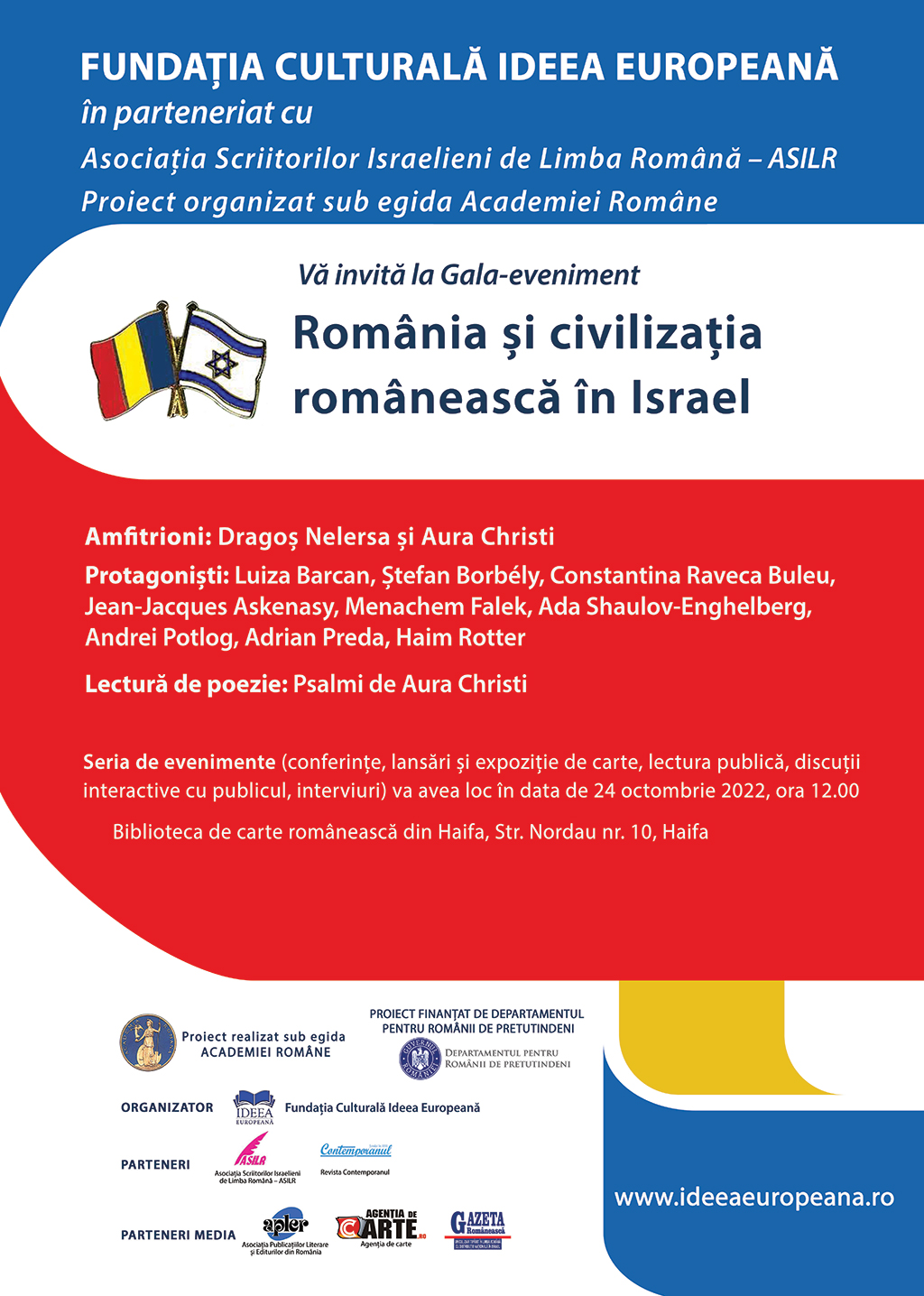 Fundația Culturală Ideea Europeană, în parteneriat cu Asociația Scriitorilor Israelieni de Limba Română (ASILR) – sub egida Academiei Române – a organizat o serie de evenimente cu genericul „România și civilizația românească în Israel” între 19 și 25 octombrie 2022 în Țara Sfântă. În anul 2022, declarat de ASILR „Anul cărții în Limba Română în Israel”, acest proiect de anvergură, cu o hartă bogată de evenimente (Tel Aviv, Ierusalim și Haifa), își propune să promoveze civilizația românească în Israel și să întărească legăturile comunității din diaspora cu România în anul în care sărbătorim Centenarul Încoronării reginei Maria și a regelui Ferdinand I Întregitorul (1922-2022) – ceremonie prin care acum un veac se desăvârșea Marea Unire de la 1918.