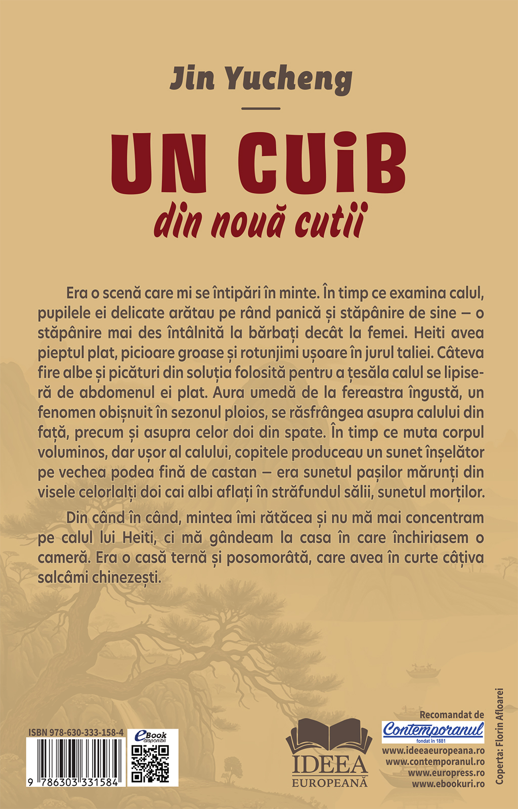 Era o scenă care mi se întipări în minte. În timp ce examina calul, pupilele ei delicate arătau pe rând panică și stăpânire de sine – o stăpânire mai des întâlnită la bărbați decât la femei. Heiti avea pieptul plat, picioare groase și rotunjimi ușoare în jurul taliei. Câteva fire albe și picături din soluția folosită pentru a țesăla calul se lipiseră de abdomenul ei plat. Aura umedă de la fereastra îngustă, un fenomen obișnuit în sezonul ploios, se răsfrângea asupra calului din față, precum și asupra celor doi din spate. În timp ce muta corpul voluminos, dar ușor al calului, copitele produceau un sunet înșelător pe vechea podea fină de castan – era sunetul pașilor mărunți din visele celorlalți doi cai albi aflați în străfundul sălii, sunetul morților.
