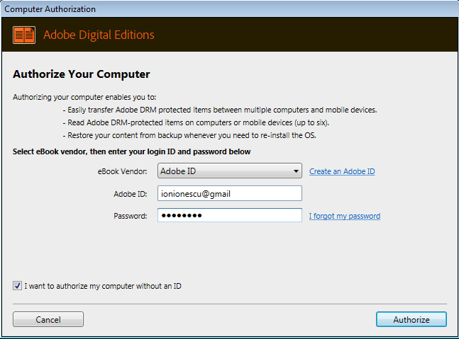Contul pe Adobe este gratuit. Aceleași date (datele dvs.) vor fi necesare pentru autorizarea contului Adobe Digital Editions.